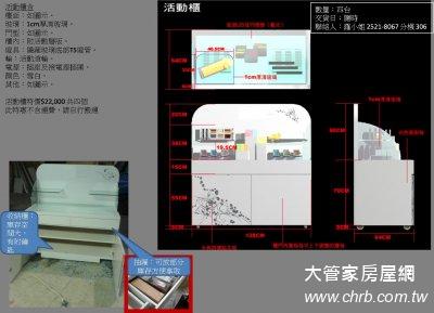 活動櫃含檯面,玻璃:1cm厚清玻璃,櫃內:附活動層版,燈具:隱藏玻璃底部T5燈管,輪:活動滾輪,電源:插座及接電源插頭,顏色:雪白,其他:如圖示。